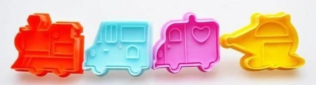 Set di 4 tagliapasta ad espulsione con tema veicoli. Il set comprende: Trenino Elicottero Ambulanza Camion. Dimensione: 5 x 5 x 2 cm